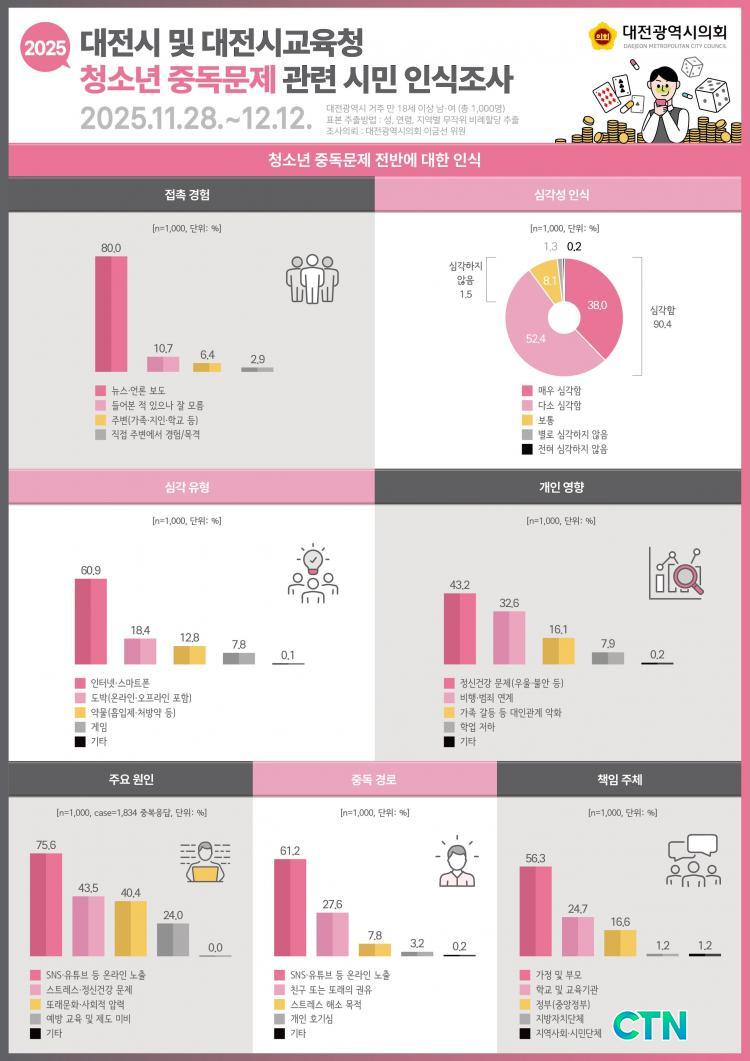 이번 여론조사는 조사전문기관을 통해 22개 문항에 대해 대전시에 거주하는 만 18세 이상 남녀 1,000명을 대상으로 2025년 11월 28일부터 12월 12일까지 15일간 실시(95% 신뢰수준 ±3.1%포인트)했으며 조사 결과 대전 시민의 90.4%가 청소년 중독문제를 ‘심각하다’고 인식하고 있는 것으로 나타나, 청소년 중독문제가 지역사회 전반의 중대한 사회 문제로 인식되고 있음이 확인됐다.